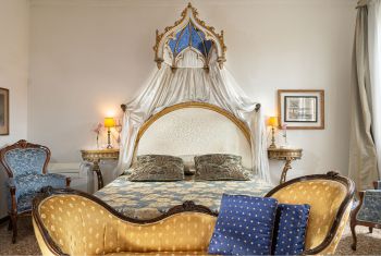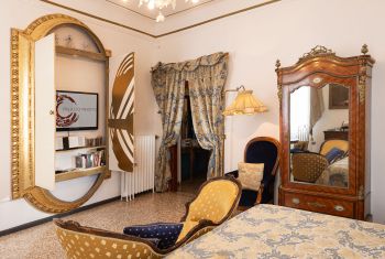 The large spaces of the room are furnished with elegance and style. The bed canopy is authentic, of the 16th century, made of golden and gauzed fabric; the headboard is of the 18th century, just like its small and rare etagere. The table is a rarity, a “Charles X”, with a grey marble top of 1840. The great golden frame in front of you comes from a Venetian palace: it was at the ceiling with a painting. Now there’re TV and dvd player!